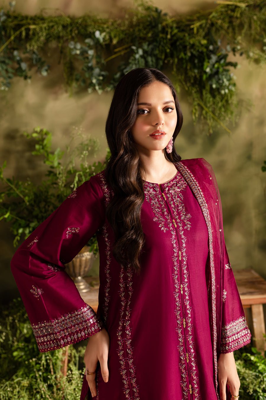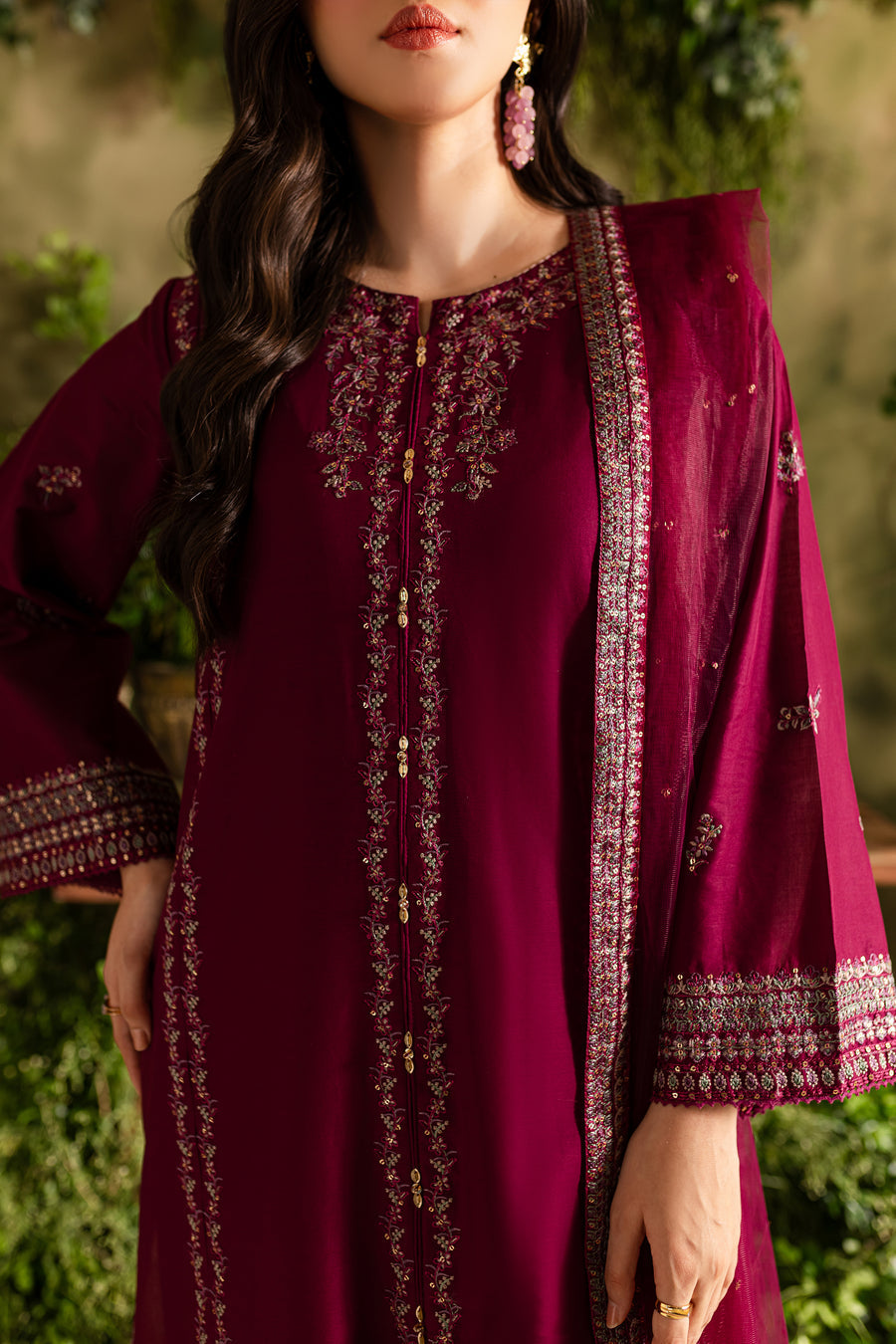 This shirt in a rich wine hue is crafted from Lawn and features long paneled design with graceful embroidery The crew neckline is looking splendid while the sleeves boast heavy embroidered borders for a standout look.